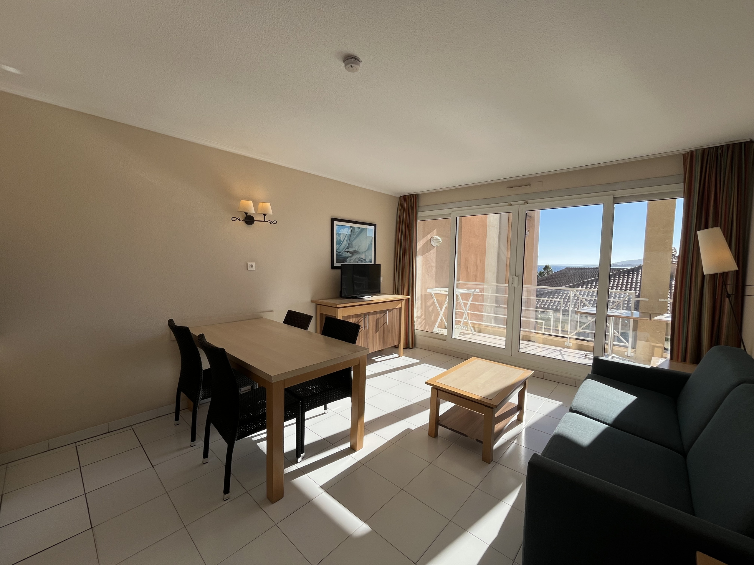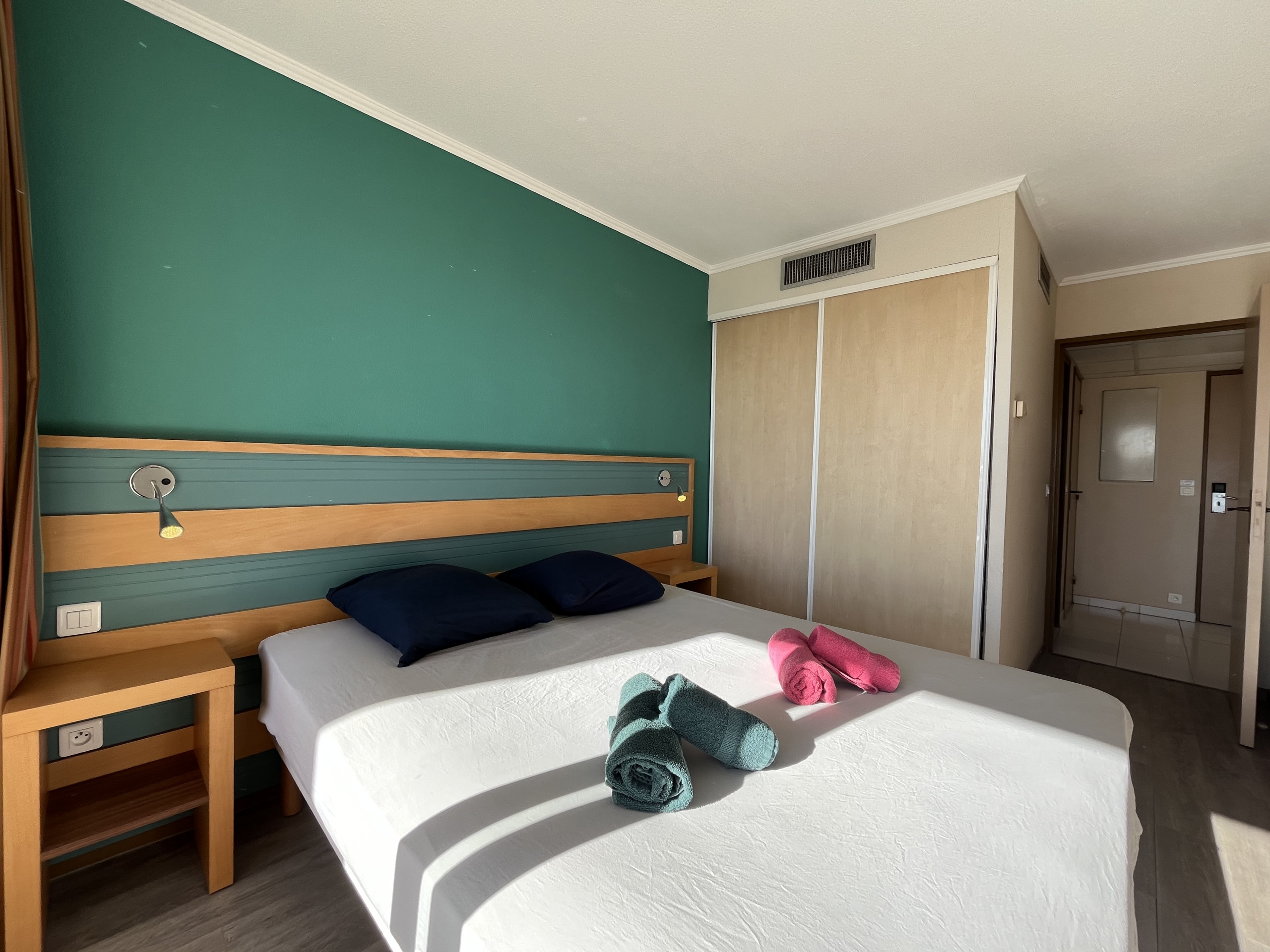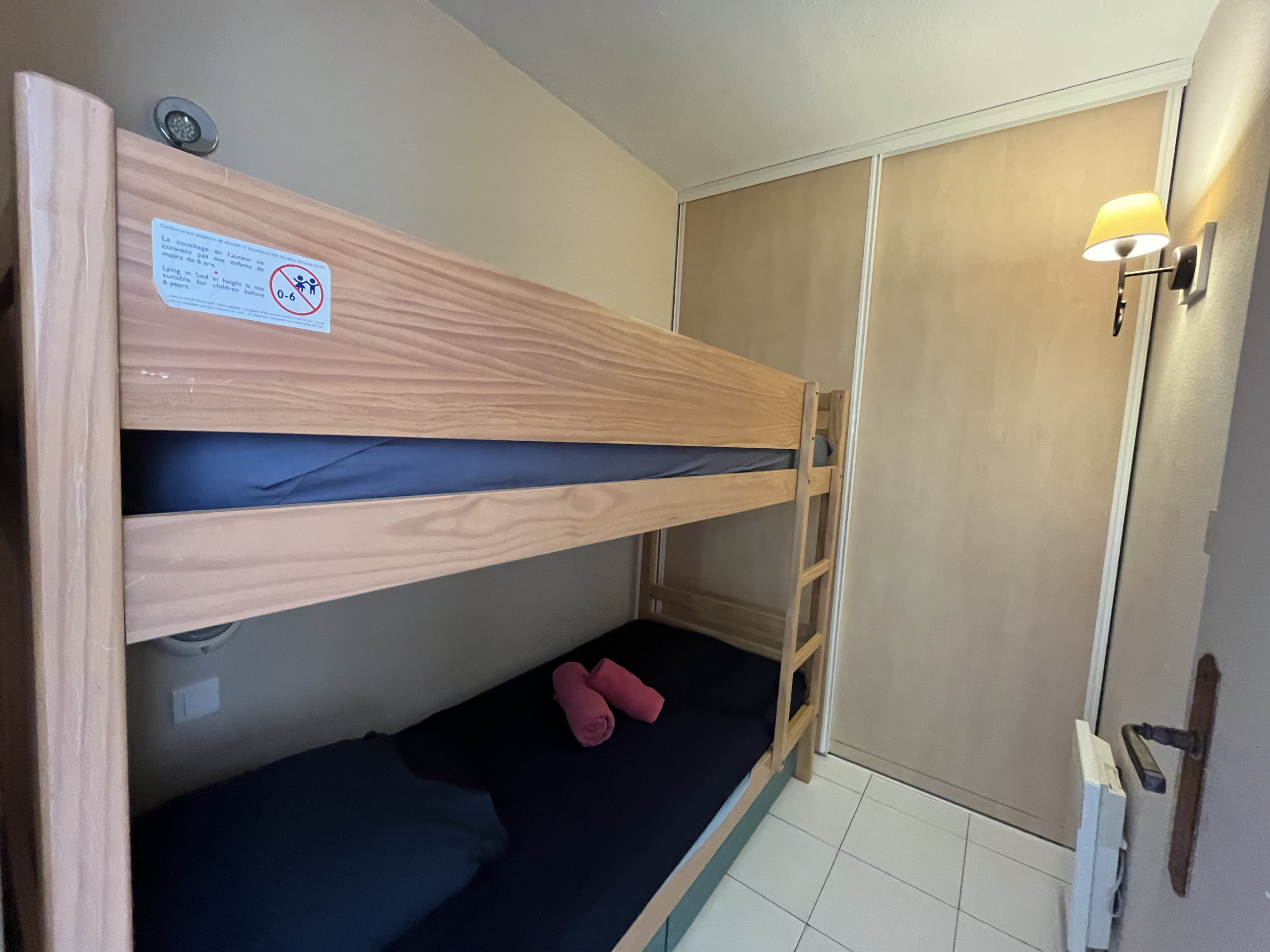These 45m2 will very easily accommodate 5 to 6 people who will enjoy a very beautiful balcony with a magnificent sea view. The entrance hall distributes from right to left: a closed room with bunk beds, the second door is the beautiful living room with open and equipped kitchen, a type sofa with 2 trundle beds, table and chairs allowing the taking of meals overlooking the large bay window, in other words a feeling of large space. The bedroom is equipped with a 160 cm bed, the renovated bathroom and the toilet complete this description.