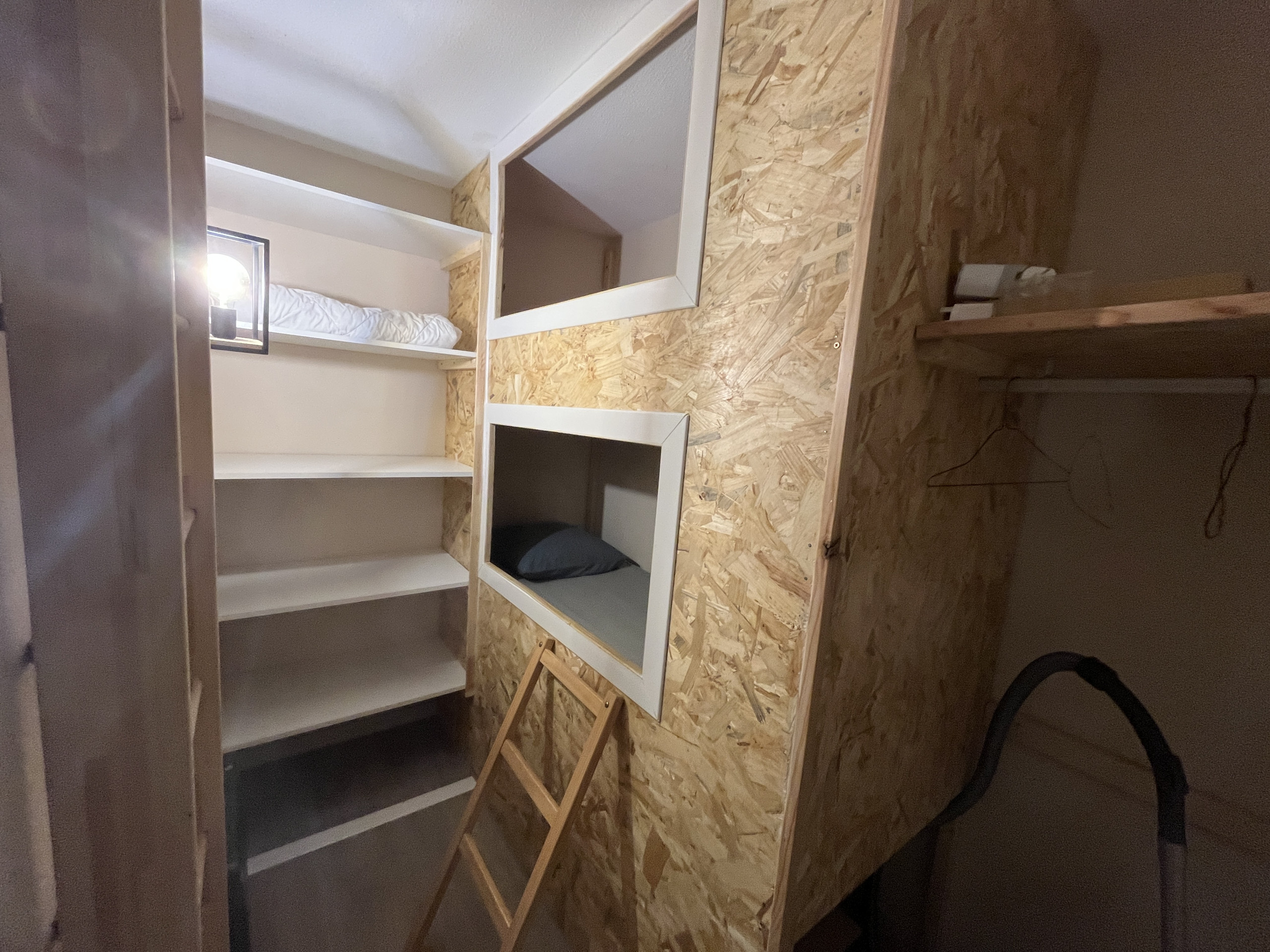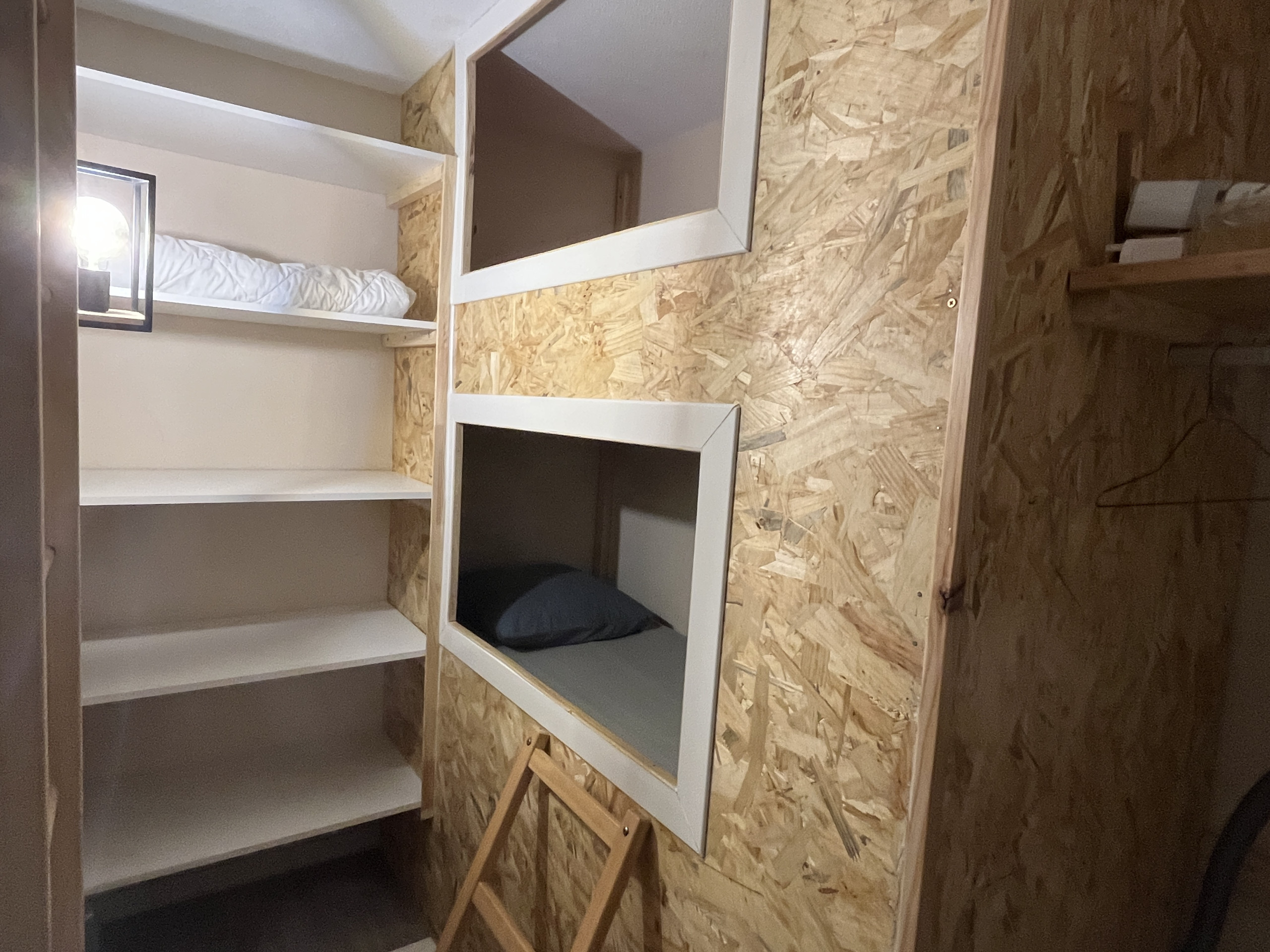 These 47m2 will very easily accommodate 5/6 people. The beautiful living room with open and equipped kitchen, a sofa convertible into a double bed, table and chairs allowing meals to be taken overlooking the large bay window, which conveys a feeling of beautiful space.