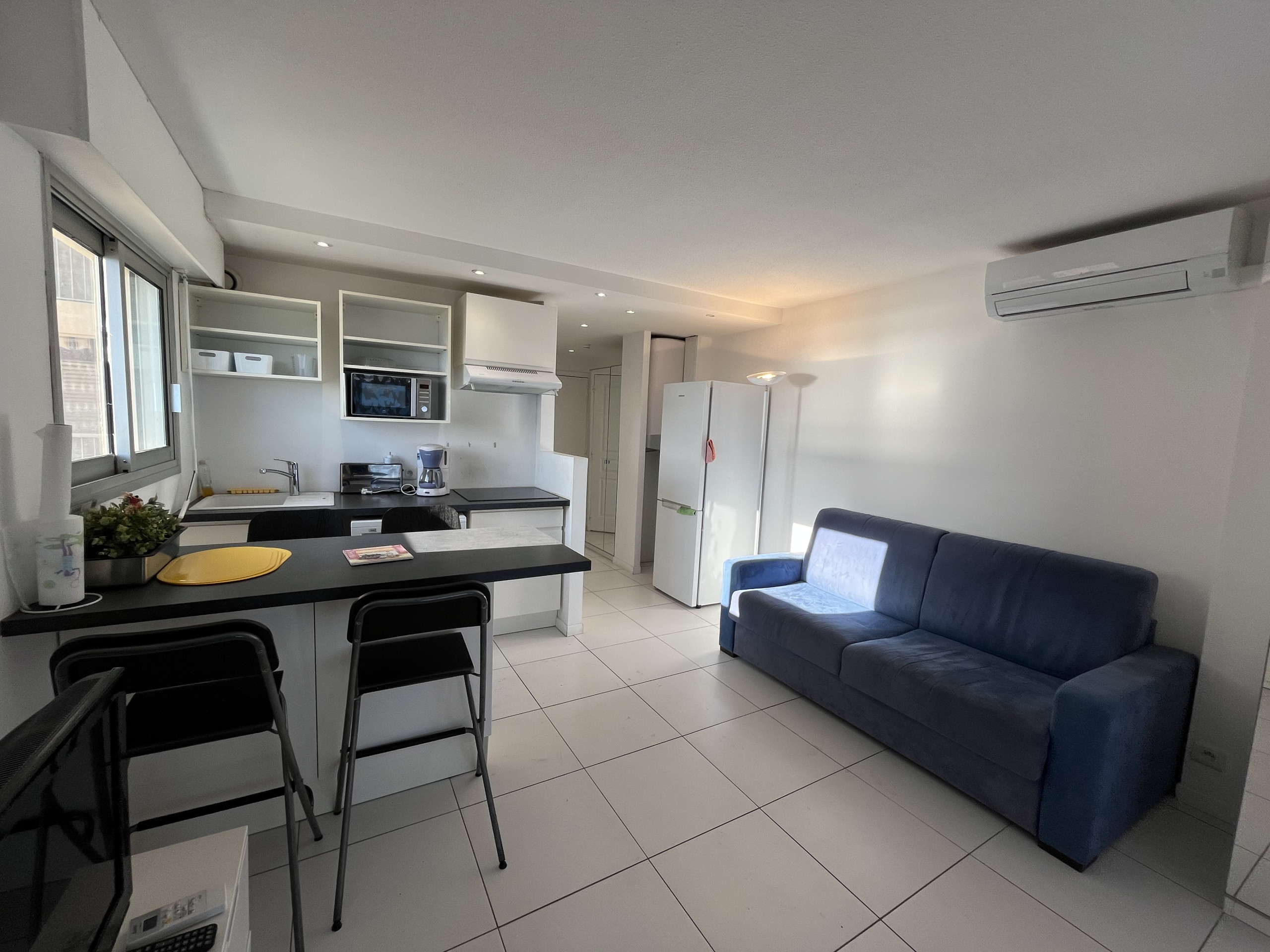 Indeed, as soon as you enter, you realize the magnificent sea view that the studio offers. Its equipment is complete: washing machine and other small household equipment and large storage space (always very practical when returning from the beach), in the open kitchen induction hob, oven, refrigerator, filter coffee maker, kettle, toaster, citrus press.