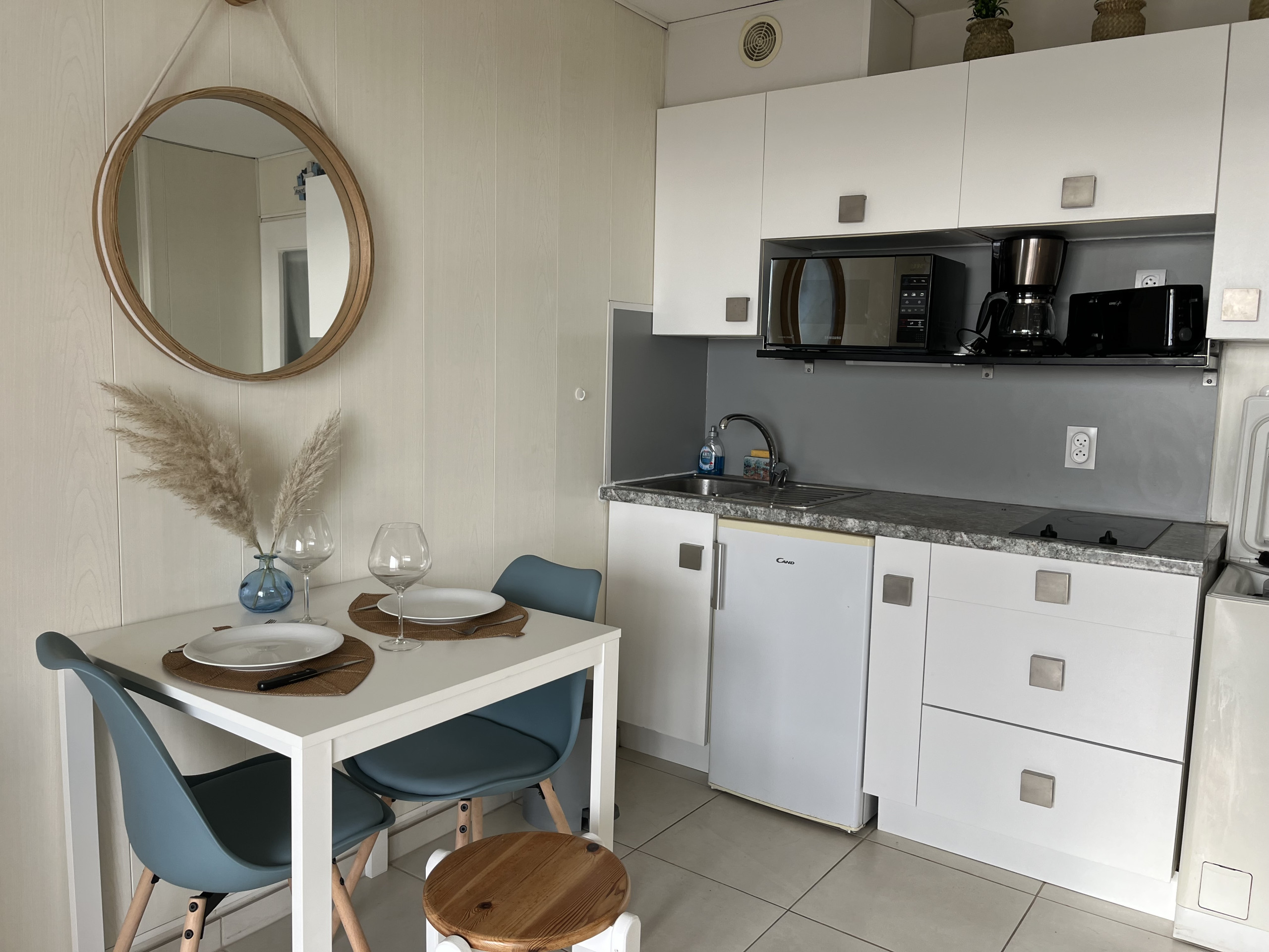 Indeed, you realise upon entering the magnificent sea view offered by the studio. The studio is well-equipped, washing machine and other small household equipment and large storage spaces (always very practical when returning from the beach), with an open kitchen with ceramic hob, microwave, refrigerator, filter coffee maker, kettle, toaster, citrus press.