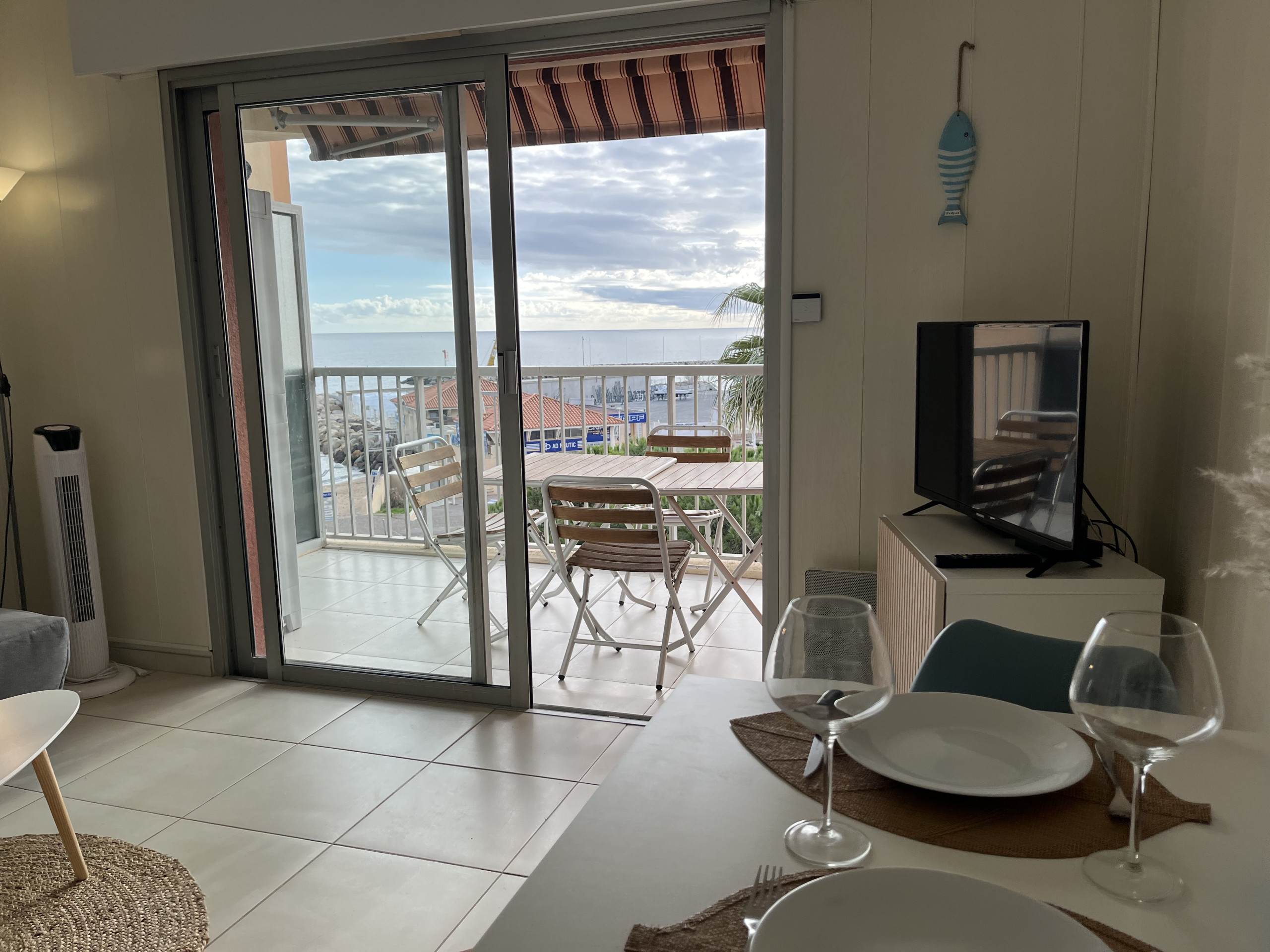 Avanzando en la vivienda, y después de la zona de cabina con sus 2 camas superpuestas, el espacio de estar es acogedor y cómodo con TV que se abre a un balcón con vista al mar y con mesa y sillas para tomar las comidas en condiciones estupendas. (el sofá cama nuevo es de 140 cm de dimensión).