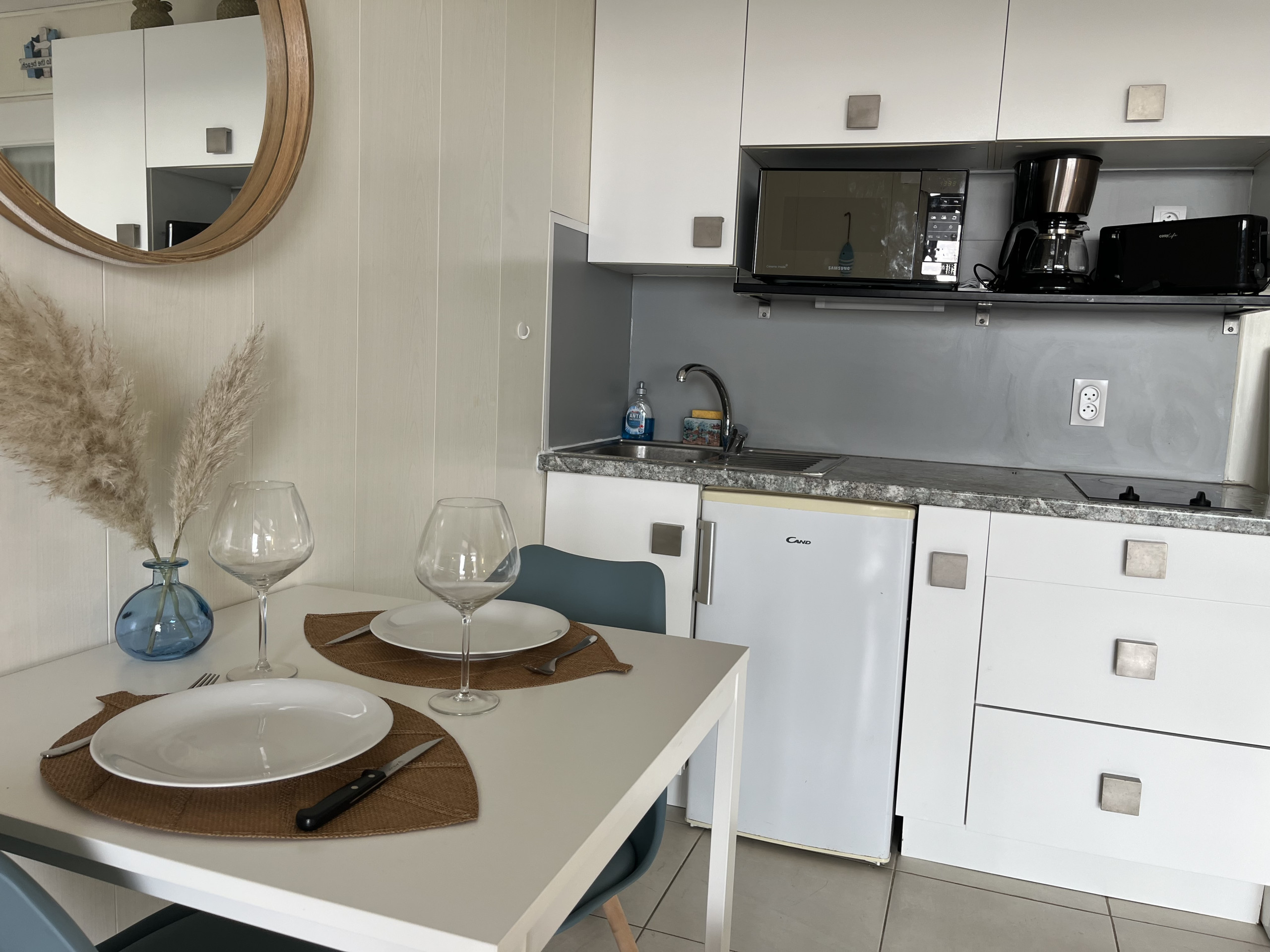 De hecho, al entrar se da cuenta de la magnífica vista al mar que ofrece el estudio. El estudio está bien equipado, lavadora y otros pequeños electrodomésticos y grandes armarios (siempre muy prácticos al regresar de la playa), con cocina abierta, placas vitrocerámicas, microondas, refrigerador, cafetera de filtro, hervidor, tostadora, exprimidor.