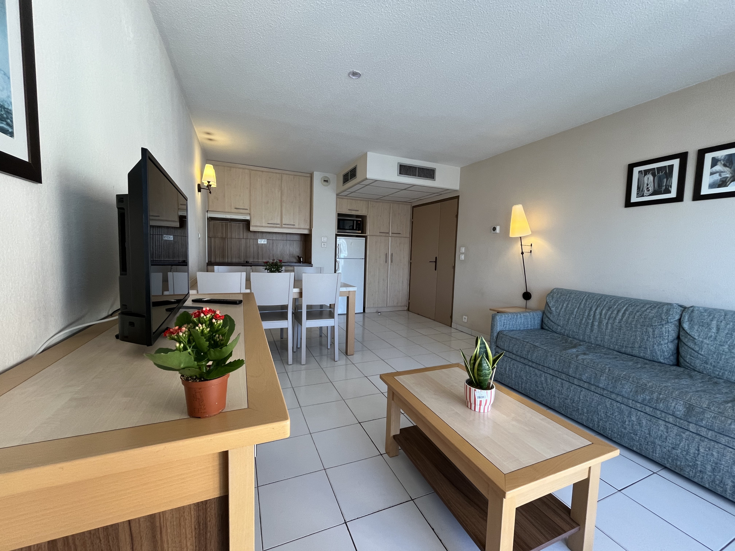 Questi 30 m2 permettono di ospitare 4 persone, idealmente per 2 adulti e 2 bambini. Il bel soggiorno è indipendente dalla cucina attrezzata, un comodo divano, tavolo e sedie permettono di consumare i pasti principalmente sul balcone quando il tempo lo permette.