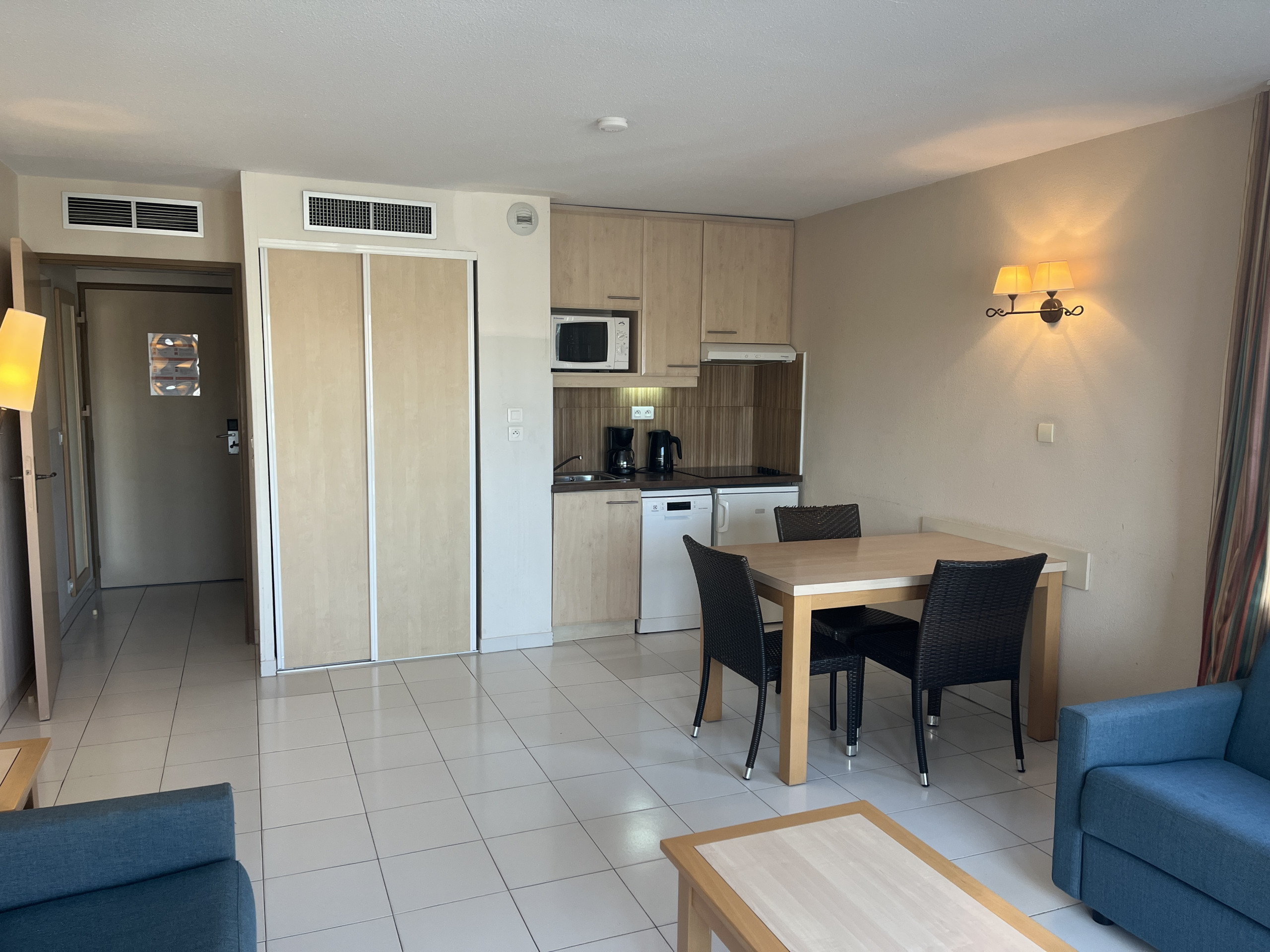 Questi 31 m2 ospiteranno molto facilmente 2/3 persone che godranno di un bellissimo balcone con una magnifica vista su Port Fréjus. Il bellissimo soggiorno con cucina aperta e attrezzata, un divano e una poltrona trasformabili in letti a 2 posti e 1 posto, tavolo e sedie che permettono di consumare i pasti con vista sulla grande vetrata, in altre parole una sensazione di bellissimo spazio.