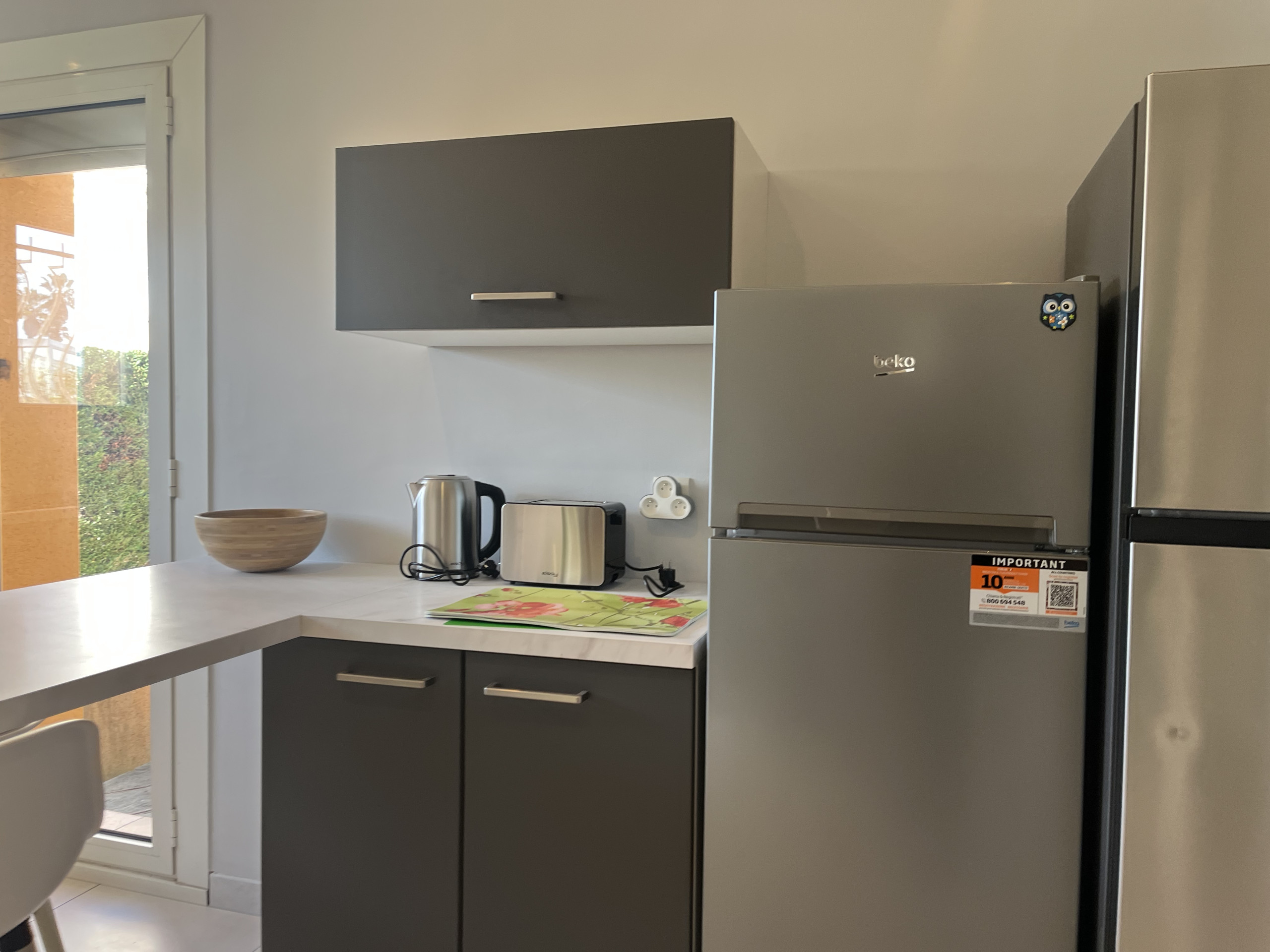 Plaques vitrocéramiques, four, micro-ondes, réfrigérateur, congélateur, lave-vaisselle, cafetière, bouilloire, grille-pain, presse-agrumes, vaisselle et ustensiles.