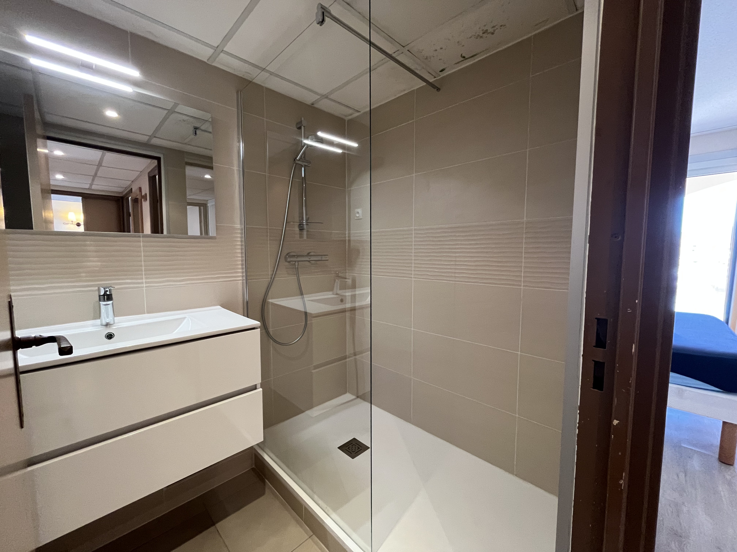 En effet, vous réalisez dès l’entrée la magnifique vue sur mer qu’offre le studio. Son équipement est complet lave-linge et autres petits équipements ménagers et grands rangements (toujours bien pratiques en rentrant de la plage), à la cuisine ouverte plaques induction, four, réfrigérateur , cafetière filtre bouilloire, grille-pain, presse agrumes.