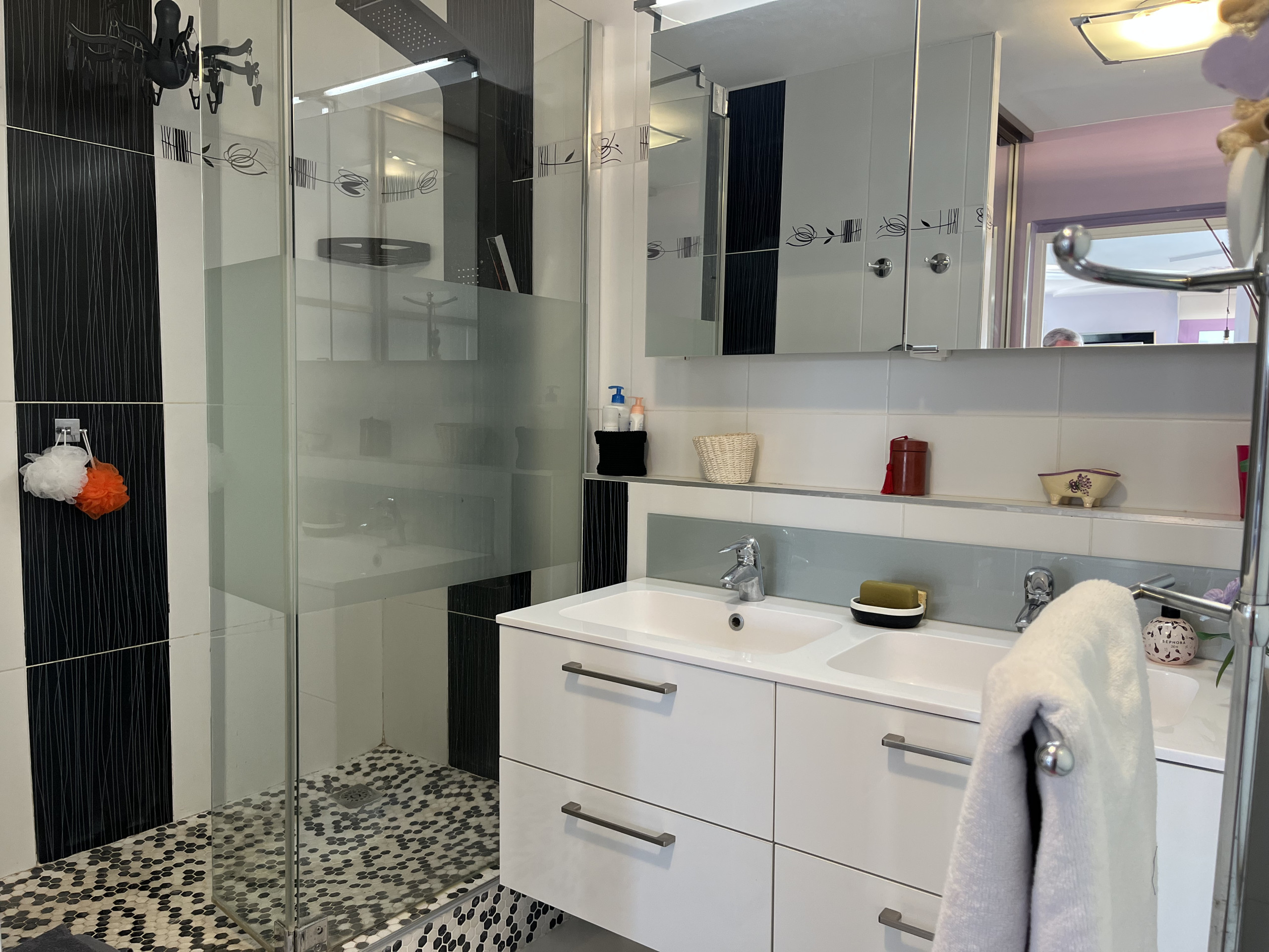 Les 2 belles chambres avec leur lit 160 par 200 sont également climatisées et offrent des beaux placards de rangements. Salle de bains avec douche à l’italienne et wc indépendant complètent ce bel appartement.