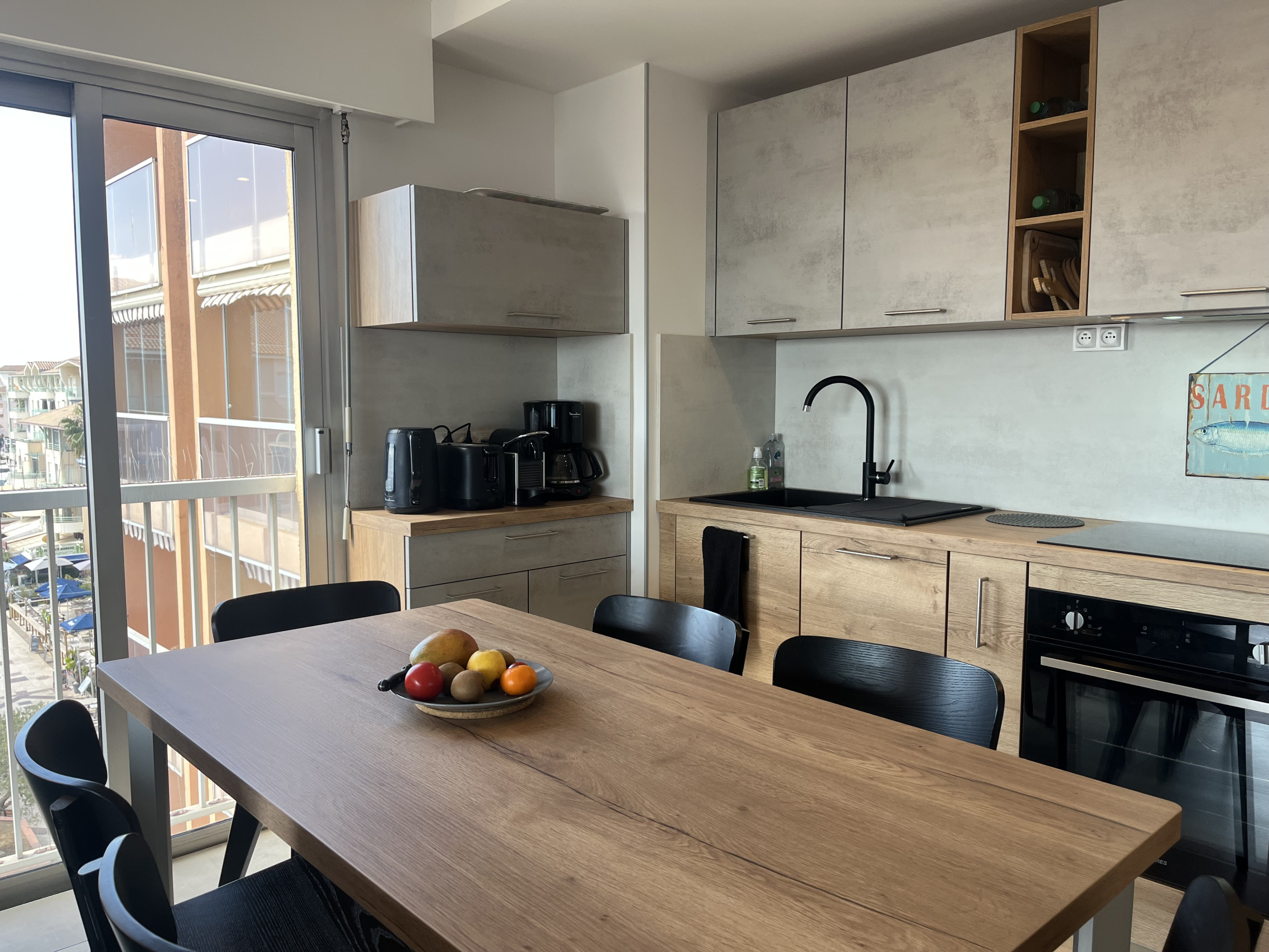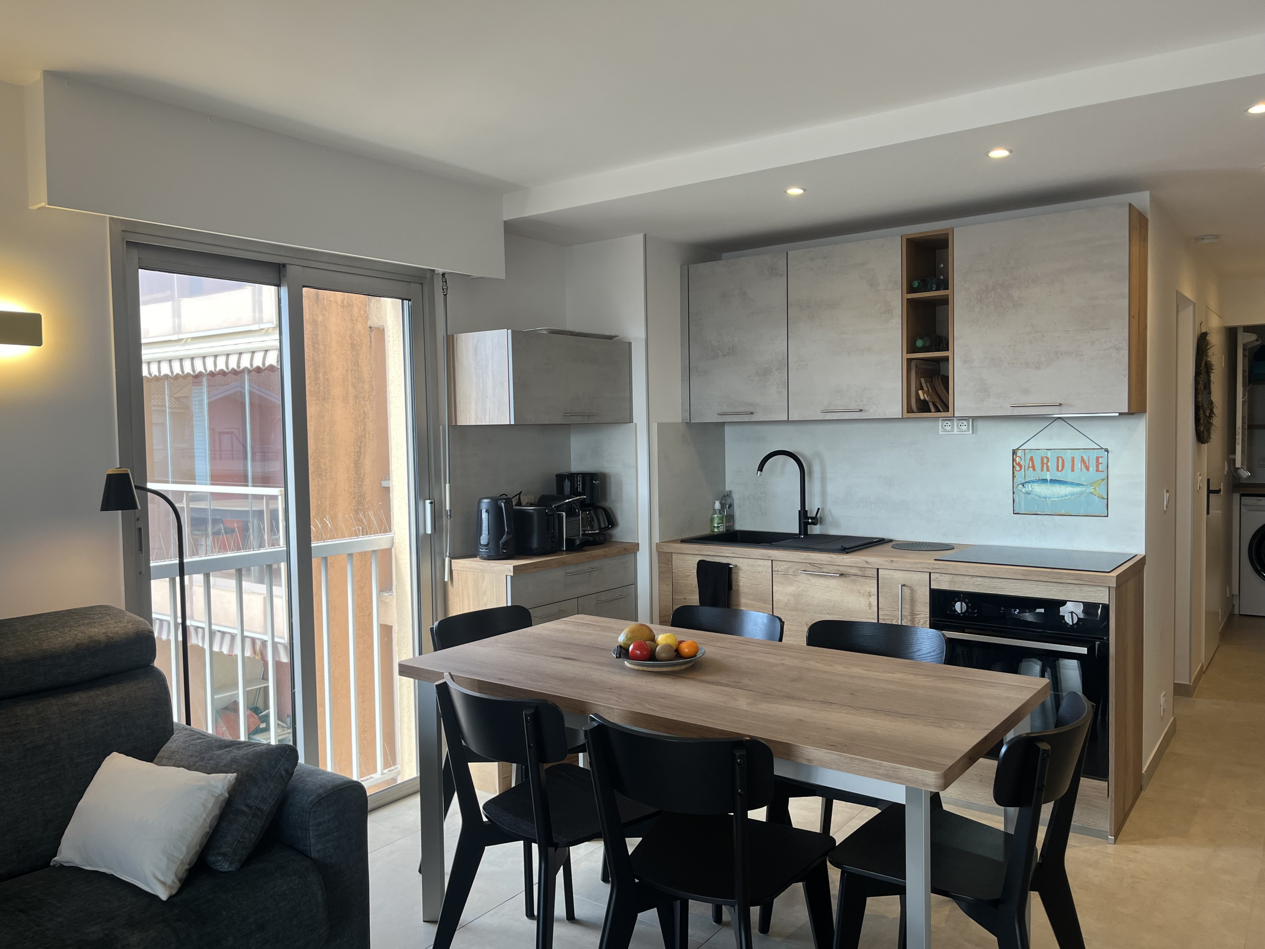 Ces 30m2 permettent le couchage de 4 personnes, idéalement pour 2 Adultes et 2 enfants. Le beau séjour est indépendant de la cuisine équipée, un canapé confortable , table et chaises permettant la prise de repas pris principalement sur le balcon lorsque la météo le permet.