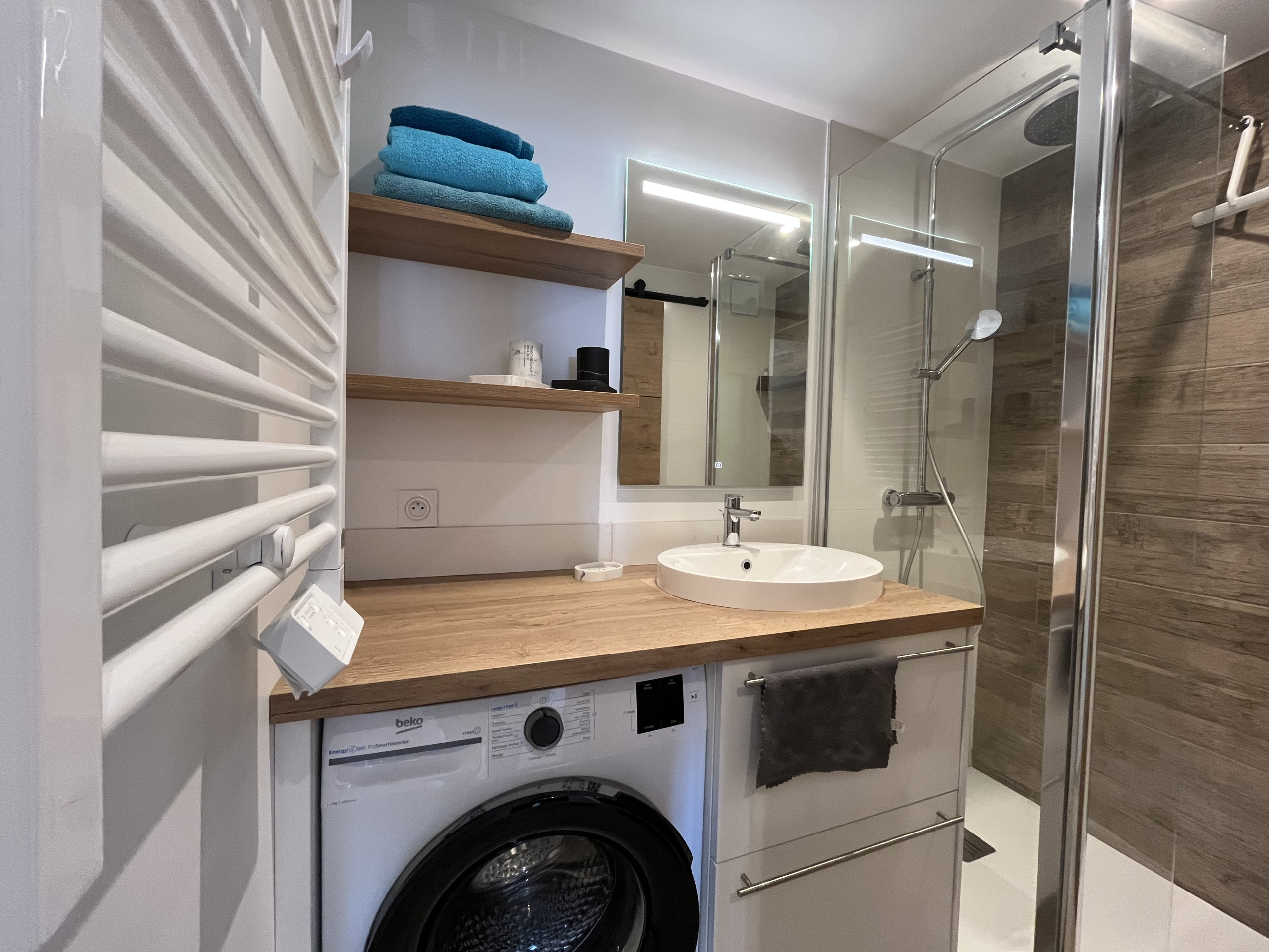 En effet, vous réalisez dès l’entrée la magnifique vue sur mer qu’offre le studio. Son équipement est complet lave-linge et autres petits équipements ménagers et grands rangements (toujours bien pratiques en rentrant de la plage), à la cuisine ouverte plaques induction, four, réfrigérateur , cafetière filtre bouilloire, grille-pain, presse agrumes.
