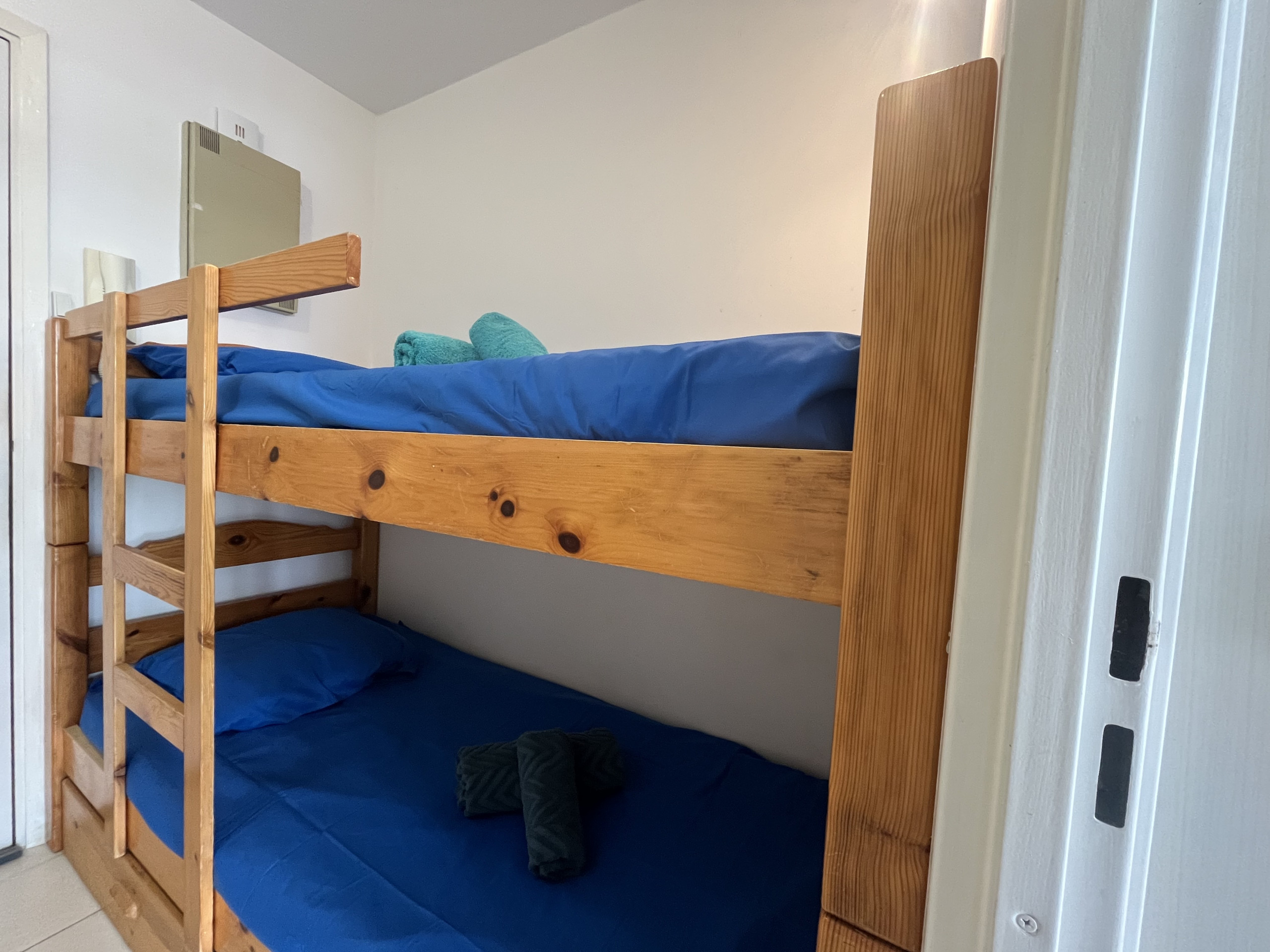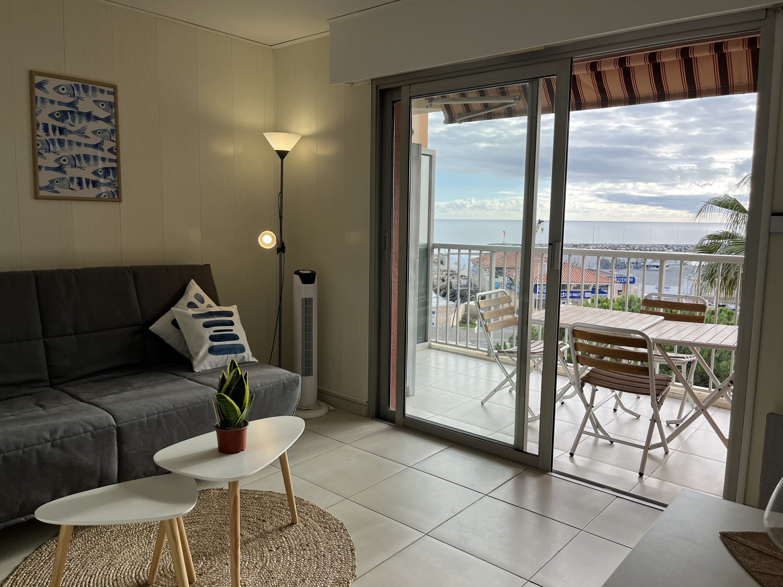 En avançant dans le logement, et après le coin cabine avec ses 2 lits superposés, l’espace salon est chaleureux et confortable avec TV s’ouvrant sur un balcon avec vue sur la mer et avec table et chaises pour la prise des repas dans de superbes conditions. (le canapé convertible neuf est de dimension de 140cm).